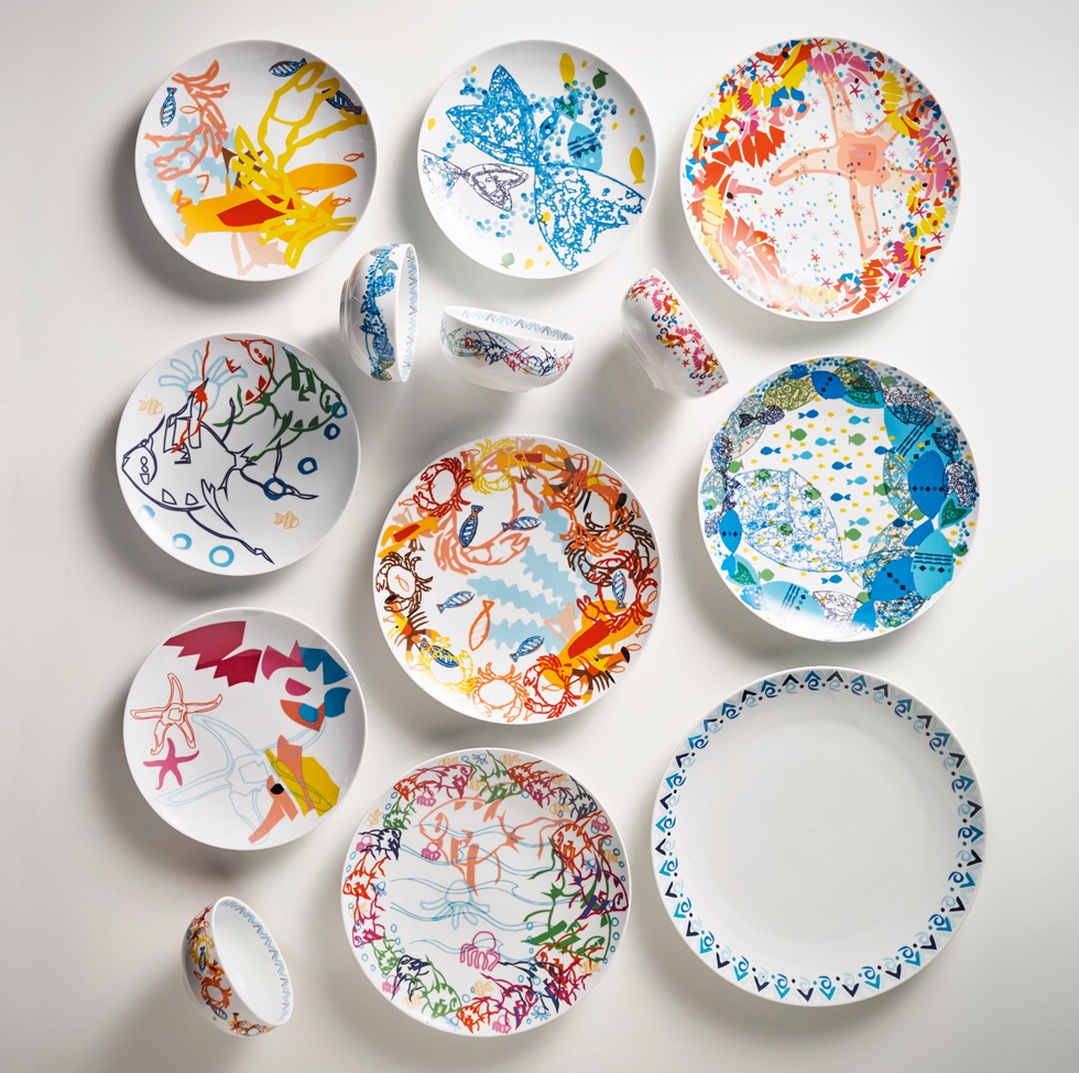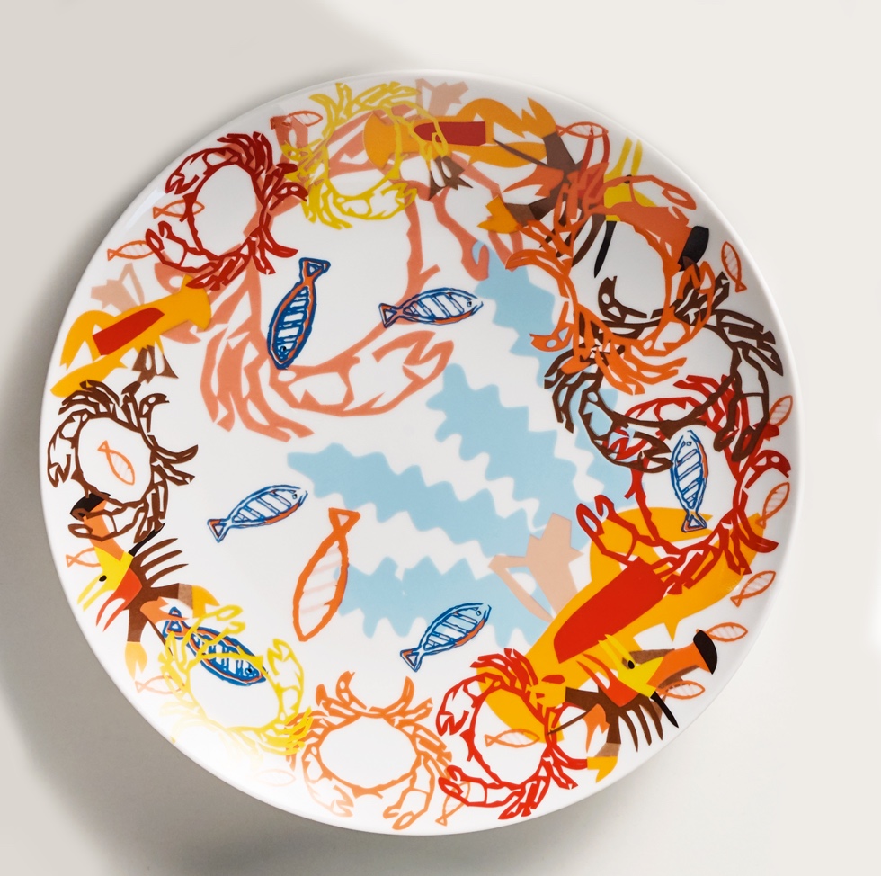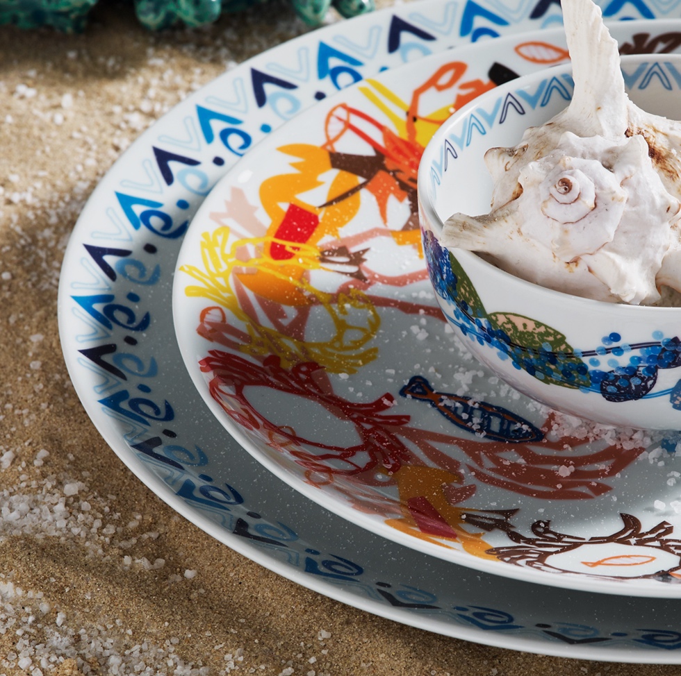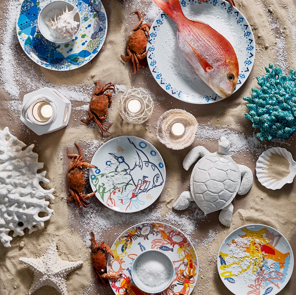A areia quente, o prateado do peixe e o mar foram a fonte de inspiração para o conjunto de mesa que convida a uma refeição ao ar livre.